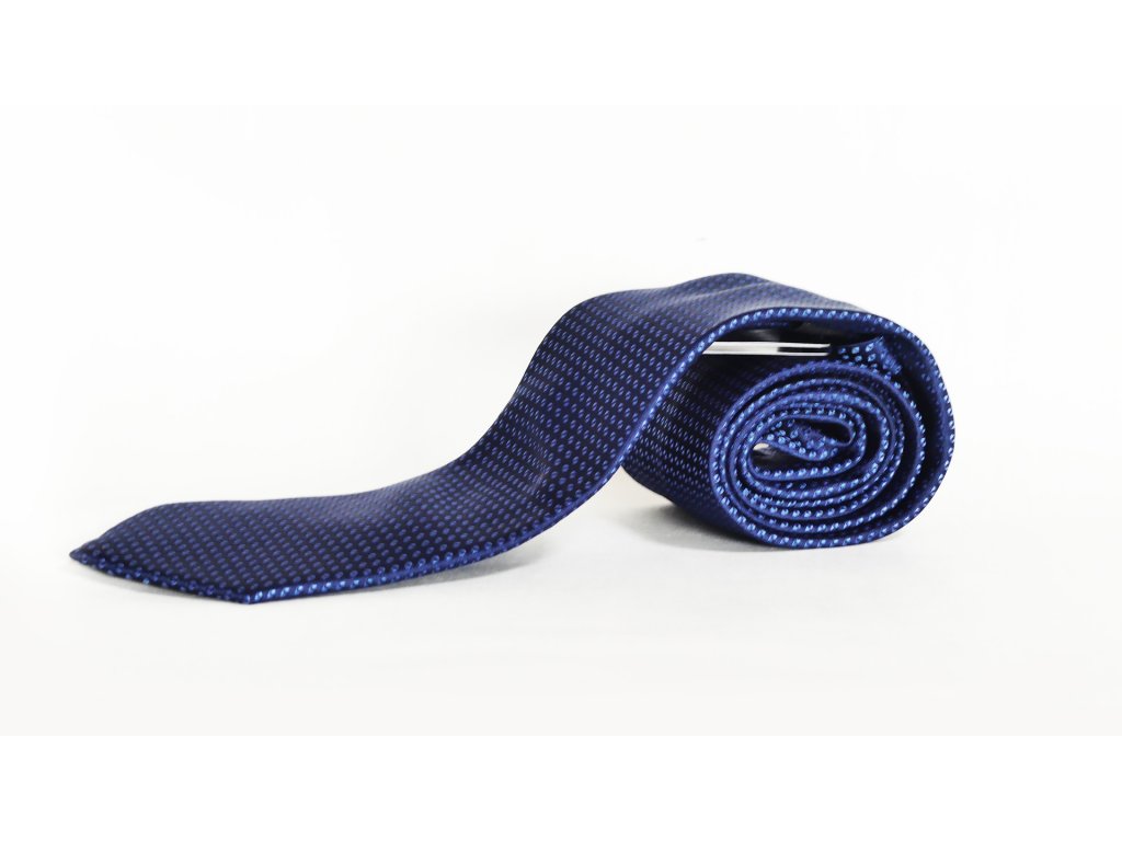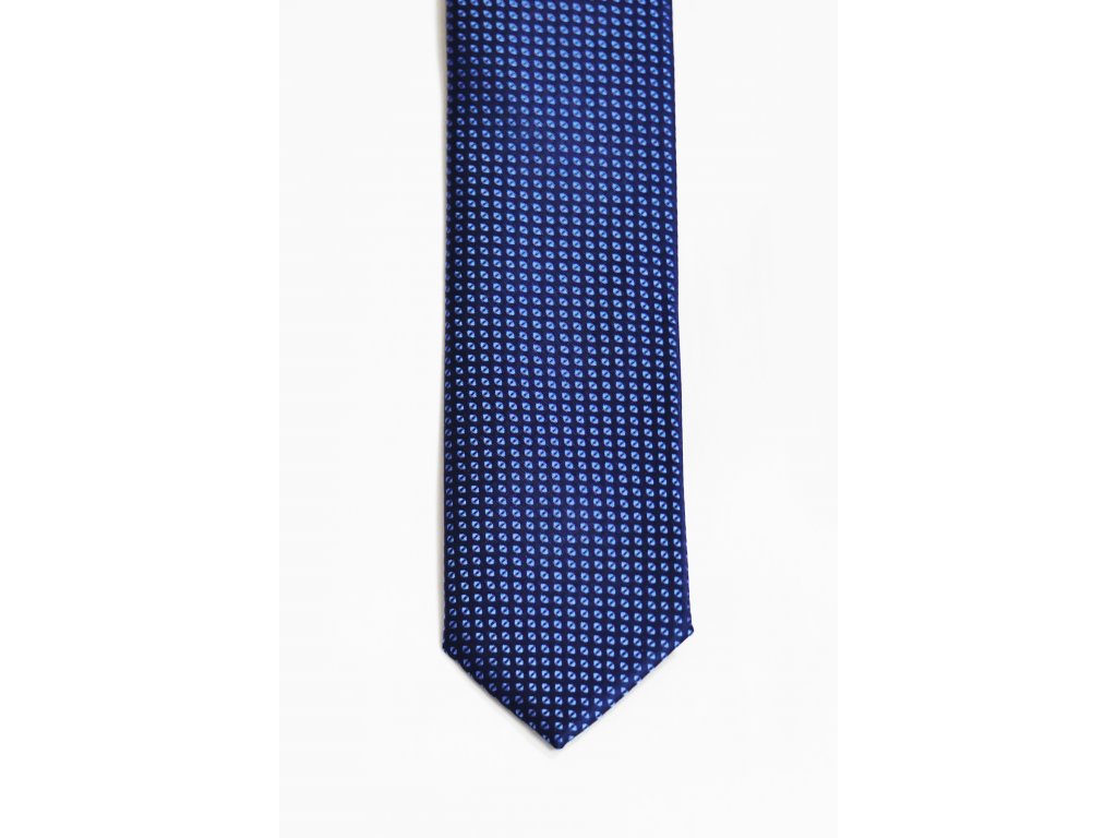 Modrá kravata s decentním vzorem je neodmyslitelnou součástí obleku, která se hodí na většinu společenských událostí.