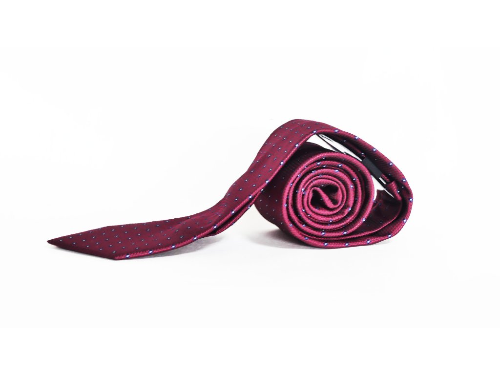 Tmavě červená kravata s decentním modro-bílým vzorem je neodmyslitelnou součástí obleku, která se hodí na většinu společenských událostí.